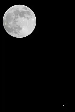 Júpiter com as luas galileanas, Io, Ganímedes, Europa e Calisto (próximo ao elongamento máximo), respectivamente, e a Lua cheia como vista em torno da conjunção em 10 de abril de 2017