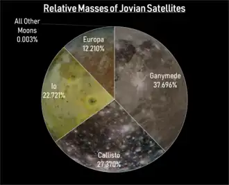 As massas relativas das luas galileanas. Aqueles menores que Europa não são visíveis nesta escala, e combinados seriam visíveis apenas com uma ampliação de 100×
