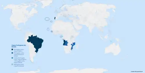 Nota: Alguns linguistas argumentam que o galego, falado na Galiza, é na verdade apenas um dialeto do português;[7][8] o que naturalmente também tornaria o noroeste da Espanha uma parte do mundo lusófono.