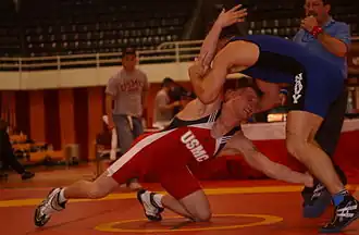 ![]() Lutador dos fuzileiros americanos (em vermelho) tenta aplica rum single leg shoot em um lutador da Marinha Americana (em azul). | |