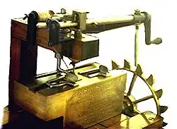 Durante boa parte da vida da máquina de costura, houve fabricação de máquinas de tamanho versátil montadas em uma base de madeira e que tinham propulsão manual através de uma manivela. Ela é antecessora da máquina de pedal.[25]