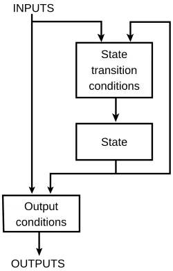 A saída produzida por um contador ou uma máquina de estado pode vir diretamente das saídas do flip-flop, ou alguns circuitos lógicos. As duas variações são chamadas de modelo Mealy de circuitos sequencial e modelo Moore.