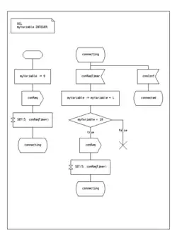 SDL incorpora tipos básicos de dados chamado Abstract Data Types, uma linguagem de ação, e uma semântica de execução, a fim de tornar a máquina de estados finita executável. Um exemplo é visto na figura 1.