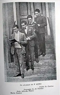 “Em 1920, recebeu menção Honrosa no Conjunto de Matérias e em Francês; em 1921, também menção Honrosa no Conjunto de Matérias e em Francês; em 1922, Menção Honrosa no Conjunto de Matérias, Religião, Português e 1° lugar em Francês e em Inglês; em 1923, Menção Honrosa no Conjunto de Matérias, em Francês e em Inglês; em 1924, Menção Honrosa no Conjunto de Matérias. Além disso, nesse ano é fundada a Academia Literária “Ruy Barbosa”, da qual um dos fundadores e presidente foi o Mário Ferreira dos Santos”.[2]