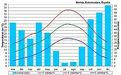 De acordo com a classificação climática de Köppen-Geiger, o clima de Mérida é do tipo mediterrânico. Os invernos são suaves, com mínimas que raramente descem abaixo de 0 °C, e os verões são quentes, com máximas que ultrapassam os 40 °C. A precipitação anual média é 532 mm. Os meses mais chuvosos novembro e dezembro; em julho e agosto praticamente quase não chove. Como na generalidade do sul da Espanha, são frequentes os ciclos de seca, os quais duram habitualmente entre dois a cinco anos. No outono o clima é mais instável, registando-se com a ocorrência de tempestades e secas. A humidade e vento são reduzidos, mas é frequente a ocorrência de nevoeiro, sobretudo no outono e inverno.