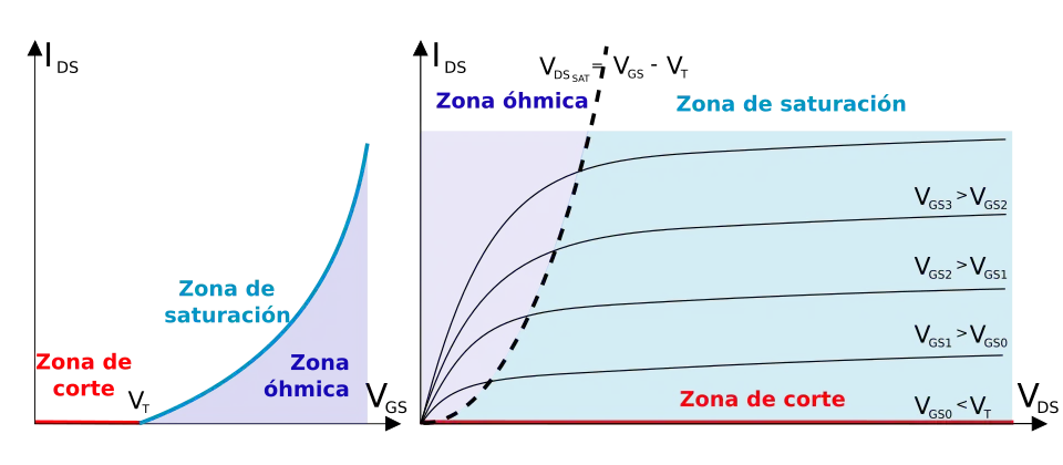 Em circuitos digitais, os MOSFETs são usadas preferencialmente as regiões de corte e região ôhmica. Em circuitos analógicos é usado o transístor em modo de saturação, o que costuma fazer confusão com o modo de saturação dos transístores bipolares de junção que são substancialmente diferentes. A saturação nos MOS é análoga a Zona Ativa Direta dos TBJ.