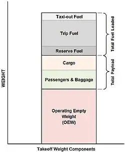 Para o cálculo do peso máximo de decolagem, é necessário inicialmente saber o "peso operacional seco" da aeronave e em seguida calcular o peso da aeronave com "zero combustível", adicionando o peso relativo ao payload (carga, passageiros e bagagem). Finalmente soma-se o peso do combustível, descontando-se a quantidade estimada que será consumida no taxiamento antes da decolagem.[1]