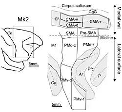 - ↑ Boussaoud, Driss; Judith (25 de novembro de 2005). «Callosal connections of dorsal versus ventral premotor areas in the macaque monkey: a multiple retrograde tracing study». BMC Neuroscience (em inglês). 6 (1). 67 páginas. ISSN 1471-2202. PMID 16309550. doi:10.1186/1471-2202-6-67