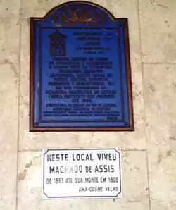 Depois do Catete, foram morar na casa n.º 18 da Rua Cosme Velho (a residência mais famosa do casal), onde ficariam até a morte. Do nome da rua surgira o apelido Bruxo do Cosme Velho, dado por conta de um episódio onde Machado queimava suas cartas em um caldeirão, no sobrado da casa, quando a vizinhança certa vez o viu e gritou: "Olha o Bruxo do Cosme Velho!".[82] Essa história acrescida à da cachorra, para alguns biógrafos, não passa de lenda.[82] Machado de Assis e Carolina Augusta teriam vivido uma "vida conjugal perfeita" por 35 anos.[34][83][84] Quando os amigos certa vez desconfiaram de uma traição por parte de Machado, seguiram-no e acabaram por descobrir que ele ia todas as tardes avistar a moça do quadro de A Dama do Livro (1882), de Roberto Fontana.[82] Ao saberem que Machado não podia comprá-lo, deram-lhe de presente, o que o deixou particularmente feliz e grato.[82]