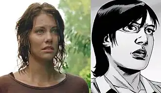 ![]() Maggie, interpretada por Lauren Cohan na série de televisão (esquerda) e na série de quadrinhos (direita). | |