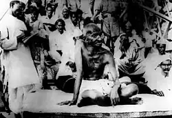A visão de Gandhi de uma Índia independente baseada no pluralismo religioso foi desafiada no início da década de 1940 por um novo nacionalismo muçulmano que exigia uma pátria muçulmana separada da Índia.[20] Em agosto de 1947, o Reino Unido concedeu a independência, mas o Império Britânico da Índia[20] foi dividido em dois domínios, a Índia de maioria hindu e o Paquistão de maioria muçulmana.[21] Como muitos indianos, muçulmanos e sikhs deslocados chegaram às suas novas terras, a violência religiosa irrompeu, especialmente em Panjabe e em Bengala. Evitando a celebração oficial da independência em Delhi, Gandhi visitou as áreas afetadas, tentando proporcionar consolo. Nos meses seguintes, ele realizou várias greves de fome para deter a violência religiosa. O último deles, realizado em 12 de janeiro de 1948, quando tinha 78 anos, também teve o objetivo indireto de pressionar a Índia a pagar alguns ativos em dinheiro devidos ao Paquistão.[22] Alguns indianos pensavam que Gandhi era muito complacente com os muçulmanos.[22][23] Entre eles estava Nathuram Godse, um nacionalista hindu, que assassinou Gandhi em 30 de janeiro de 1948, disparando três vezes contra seu peito.[23]