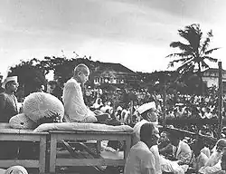 Mohandas Karamchand Gandhi (em gujarati: મોહનદાસ કરમચંદ ગાંધી) (Porbandar, 2 de outubro de 1869Nova Deli, 30 de janeiro de 1948), mais conhecido como Mahatma Gandhi ("Venerável Gandhi", sendo Mahatma um título), foi um advogado,[2] estadista,[3][4] líder espiritual[5] e ativista indiano. Considerado também um líder religioso,[6] além de nacionalista, anticolonialista[7] e especialista em ética política indiana.[8] Ficou conhecido por ter empregado a resistência não violenta para liderar a campanha bem-sucedida pela independência da Índia do Reino Unido[9] e, por sua vez, por inspirar movimentos pelos direitos civis e pela liberdade em todo o mundo. O título honorífico Mahātmā (do sânscrito: "de grande alma", "venerável"),[10] aplicado-lhe pela primeira vez em 1914 na África do Sul,[11] é agora usado em todo o mundo. O aniversário de Gandhi, 2 de outubro, é comemorado na Índia como Gandhi Jayanti, um feriado nacional e em todo o mundo como o Dia Internacional da Não Violência. Gandhi nasceu e foi criado em uma família hindu no litoral de Guzerate, oeste da Índia, e se formou em Direito no Inner Temple, Londres, Inglaterra. É comumente — embora não formalmente — considerado o Pai da Pátria indiana,[12][13] também chamado de Bapu[14] (Guzerate: carinho por pai,[15] papa[15][16]).