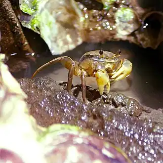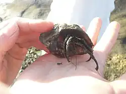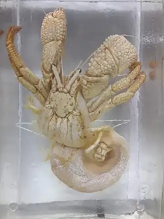 Caranguejo ermitão (Decapoda, Anomura) ocupando a concha de um gastrópode.
