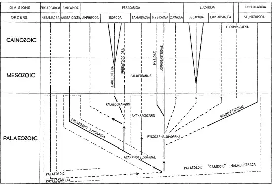 Esses animais restringiram-se às águas tropicais de Laurência até a formação de Pangeia no Permiano, quando então se dispersaram pelo mundo. E de maneira geral, é no Paleozoico que surge uma grande variedade de Phyllocarida, Hoplocarida, e Eumalacostraca primitivos, como veremos abaixo.[9]