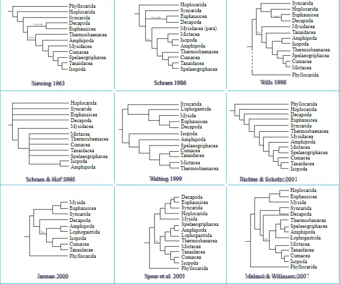 Em 1998, Wills apresentou uma análise de todo o grupo Crustacea, e concluiu que Malacostraca não é monofilético.[11] Entretanto, atualmente os pesquisadores estão de acordo com a monofilia dos Malacostracos, e isto raramente tem sido questionado.[2][11][19]