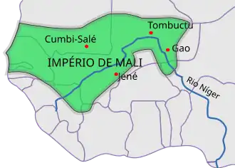 O Império do Mali se formou na parte superior do Rio Níger e chegou à sua força máxima em meados do século XIV. Sob o reinado do Império do Mali, as antigas cidades de Djené e Tombuctu foram importantes centros de comércio e de aprendizagem islâmica. O reino entrou em declínio e, posteriormente, foi resultado de conflitos internos, e até ser substituído pelo Império Songai. O povo songai é originário do noroeste da atual Nigéria, cujo império tinha sido há muito tempo uma potência na África Ocidental sob o controle do Império de Mali.[19]