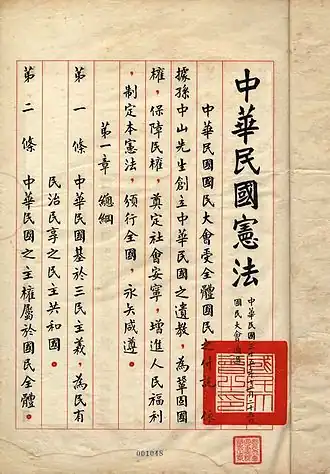 A seguir, está o primeiro artigo da Constituição da República da China de 1947, emenda atual, disposta em sua escrita original (caracteres tradicionais), com romanização em pinyin e tradução para o português. Esse documento é histórico para a China continental, mas é válido em Taiwan com a emenda de 2005.[18]