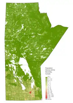No censo de 2011, Manitoba tinha uma população de 1 208 268, mais da metade da qual está na Região da Capital Winnipeg. Winnipeg é a oitava maior região metropolitana do Canadá, com uma população de 730 018 no censo de 2011.[69] Embora a colonização inicial da província tenha girado principalmente em torno da agricultura, o último século viu uma mudança em direção à urbanização. Manitoba é a única província canadense onde mais de 55% de sua população está centralizada em uma única cidade.[7]