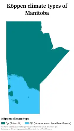 As partes norte da província, que inclui a cidade de Thompson, estão na zona climática subártica (Dfc). Essa região apresenta invernos longos e extremamente frios e breves verões quentes com pouca precipitação.[58] Temperaturas noturnas tão baixas quanto −40 °C ocorrem em vários dias a cada inverno.[58]