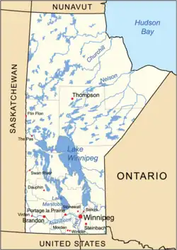- ↑ Travel Manitoba. Geography of Manitoba [archived 29 de novembro 2010; citado em 10 de fevereiro de 2010].