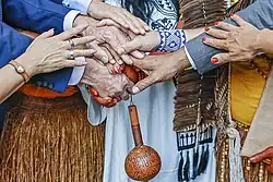 Em muitas tradições espirituais indígenas e afro-brasileiras, a maraca também pode desempenhar uma função sagrada. Entre o povo Tabajara do Brasil, a maraca é considerada um “objeto sagrado” usado durante o ritual do Toré. Ela representa um canal entre os mundos humano e espiritual, facilitando a comunicação com espíritos ancestrais conhecidos como Encantados. Elementos decorativos como penas e pinturas simbólicas ampliam seu poder espiritual.[4]