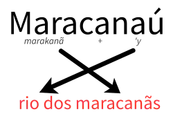 Conforme Eduardo Navarro em seu Dicionário de Tupi Antigo (2013), o topônimo "Maracanaú" vem da língua tupi, significando "rio das maracanãs", através da junção dos termos marakanã (maracanã) e 'y (rio).[10] Sua denominação original era Vila do Santo Antônio do Pitaguary. A partir de 1890, adotou seu atual nome.[11]