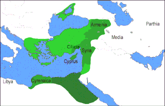 O oriente necessitava urgentemente de uma reorganização depois do período de governo dos liberatores nos anos anteriores. Além disso, Roma lutava contra o Império Parta pelo controle do Oriente Próximo. A ameaça parta ao governo do Triunvirato era iminente pois eles eram aliados dos liberatores na recém-encerrada guerra civil, fornecendo inclusive tropas em Filipos.[106] Como mestre do oriente, Antônio também assumiu a responsabilidade de supervisionar a invasão da Pártia planejada por Júlio César para vingar a humilhante derrota do triúnviro Crasso na Batalha de Carras em 53 a.C..