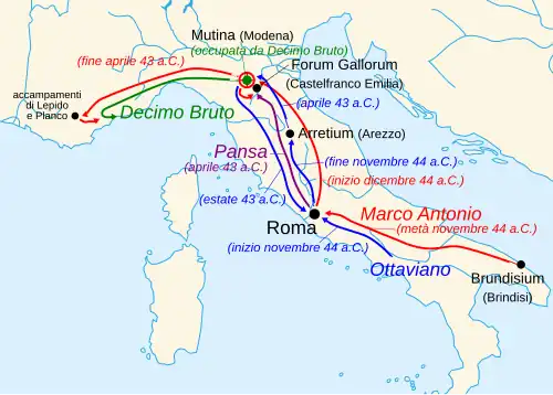 Ratificando o comando extraordinário de Otaviano em 1 de janeiro de 43 a.C., o senado despachou-o juntamente com os novos cônsules, Hírcio e Pansa para derrotar Antônio e suas cinco legiões, uma operação conhecida como Campanha de Mutina.[88][89] Ele foi derrotado na Batalha de Mutina, em abril de 43 a.C., e forçado a se retirar para a Gália Transalpina. Os dois cônsules foram mortos, porém, deixando Otaviano como comandante único dos exércitos republicanos, um total de oito legiões.[90][91]