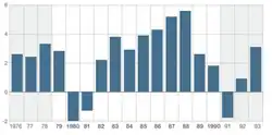 Em 1982, a economia britânica começou a apresentar sinais de recuperação; a inflação baixou para 8,6 por cento em relação aos 18 por cento iniciais, mas o desemprego foi superior a 3 milhões pela primeira vez desde a década de 1930.[140][141] Em 1983, o crescimento econômico total foi mais forte e as taxas de inflação e hipotecas caíram para seus níveis mais baixos em 13 anos, embora o desemprego total permaneceu alto, com 3,3 milhões de desempregados em 1984.[142][143] Em 1987, o desemprego estava caindo, a economia era estável e forte e a inflação era baixa. As pesquisas de opinião mostraram uma confortável liderança dos conservadores, e os resultados das eleições locais também foram exitosas aos governistas, levando Thatcher a solicitar eleições gerais que ocorreram em junho daquele ano, apesar de uma eleição só precisar ser realizada doze meses depois. O pleito resultou em Thatcher sendo reeleita para um terceiro mandato com uma maioria de 376 deputados de um total de 650, conseguindo 42,2 por cento dos votos populares.[144]
