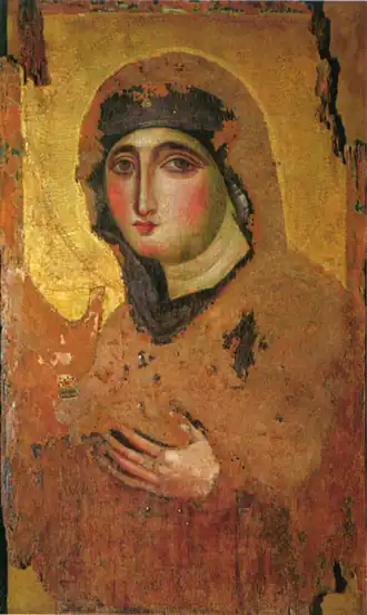 A mais antiga oração mariana que se conhece (o sub tuum praesidium, ou sob vossa proteção) é do início do século II e seu texto foi redescoberto em 1917 em um papiro no Egito.[30][31] Após o Édito de Milão em 313, imagens artísticas de Maria começaram a aparecer em maior número em grandes igrejas estavam sendo dedicadas a ela, como por exemplo, a Basílica de Santa Maria Maior, em Roma.[32][33][34]