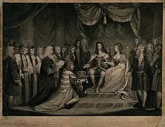 Em 13 de fevereiro de 1689, o parlamento aprovou uma declaração que afirmava que Jaime tinha abdicado do governo ao fugir em 11 de dezembro do ano anterior e que o trono estava dessa forma vago.[47][48] O parlamento ofereceu a coroa a Guilherme e Maria como co-monarcas, não a Jaime Francisco Eduardo que seria o herdeiro aparente em circunstâncias normais. O único precedente de uma monarquia conjunta vinha do século XVI: quando Maria I se casou com Filipe de Espanha, foi concordado que o segundo tomaria o título de rei durante a vida de sua esposa, com restrições colocadas em seu poder. Porém, Guilherme seria rei mesmo após a morte de Maria e "o único e completo exercício do poder régio [seria] executado pelo dito Príncipe de Orange em nome dos ditos Príncipe e Princesa durante sua vidas conjuntas".[47] A declaração foi posteriormente estendida para excluir do trono não apenas todos os herdeiros de Jaime (com exceção de Ana), mas também todos os católicos pois "foi encontrado por experiência que é inconsistente com a segurança e bem estar deste reino Protestante ser governado por um príncipe papista".[48]