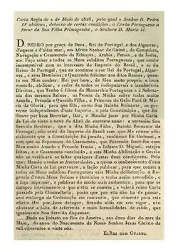 Pedro ascendeu ao trono português em março de 1826, como Pedro IV. A 29 de abril, outorgou aos portugueses uma constituição livre, a carta constitucional. Porém, rapidamente abdicou em favor da sua filha mais velha, que se tornou Rainha de Portugal e dos Algarves como Maria II, aos sete anos de idade, pois os brasileiros não aceitaram que o imperador cingisse a coroa portuguesa, o que resultaria na unidade da antiga monarquia, da qual se haviam libertado.