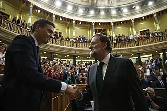 Nas eleições gerais de 26 de junho de 2016,[83] o Partido Popular recebeu 39,14% dos votos e assegurou 137 assentos no Congresso dos Deputados (14 a mais com relação às eleições anteriores).[84] Com tal resultado, o partido manteve a maioria absoluta no Senado, voltando a ser a força política com maior número de votos e o único partido com melhora de resultado.[85][86][87] Após uma série de reuniões com a Casa Real, Mariano Rajoy aceitou oficialmente o convite de formar um governo.[88][89][90]