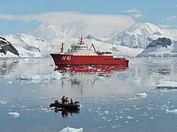 A logística naval sustenta bases científicas nos remotos arquipélagos de São Pedro e São Paulo e Trindade e Martim Vaz com a expressa intenção de que contem como "ilhas habitadas" para fins de projeção de zona econômica exclusiva no mar ao seu redor. São Pedro e São Paulo é um posto avançado pouco habitável, que recebe apenas quatro pessoas em turnos quinzenais, com um navio sempre à espera para o caso de uma emergência.[59][60] A Estação Antártica Comandante Ferraz[61] e a logística do Programa Antártico Brasileiro são operadas pela Marinha.[62] As primeiras expedições navais ao continente permitiram ao Brasil ser aceito em 1983 como parte consultiva do Tratado da Antártica.[63]