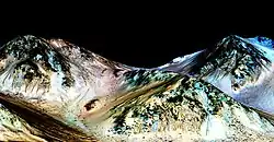 Outras características geológicas, como deltas e leques aluviais preservados em crateras, também apontam para condições mais quentes e mais úmidas em algum intervalo ou intervalos na história antiga de Marte.[88] Tais condições requerem necessariamente a presença generalizada de lagos de cratera em uma grande proporção da superfície, para os quais também há evidências mineralógicas, sedimentológicas e geomorfológicas independentes.[89] Outras evidências de que a água líquida existiu em algum momento sobre a superfície de Marte vêm a partir da detecção de minerais específicos, como hematita e goethita, ambos os quais se formam, por vezes, na presença de água.[90]