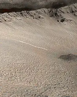 Estrias são comuns em Marte e novas aparecem com frequência em encostas íngremes de crateras, desfiladeiros e vales. As estrias são escuras no início e ficam mais claras com o tempo. Elas podem começar em uma pequena área e, em seguida, espalhar-se por centenas de metros. Elas também foram vistas seguindo as bordas das pedras e outros obstáculos em seu caminho. As teorias mais comumente aceitas indicam que elas são camadas subjacentes escuras do solo descobertas após avalanches de poeira brilhante ou redemoinhos.[59] Várias explicações têm sido propostas, algumas das quais envolvem água ou mesmo o crescimento de organismos.[60][61]