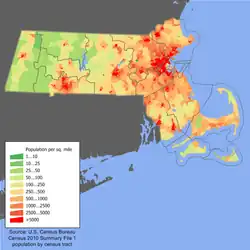 Cerca de 45% da população de Massachusetts vive em cidades, e mais de 94% da população vive em regiões metropolitanas.