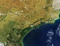 ![]() Mapa da ecorregião da Mata Atlântica definida pelo WWF. A linha amarelo escuro representa os limites dessa ecorregião. Imagem de satélite da NASA. | |