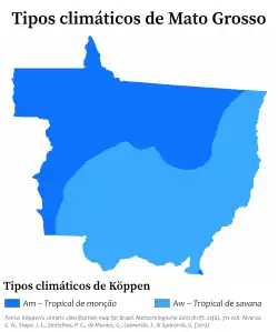 No estado de Mato Grosso a predominância de dois tipos de clima. O clima tropical de savana (Aw, segundo a classificação climática de Köppen-Geiger), é predominante em grande parte do território da região norte do estado e ainda abrange municípios de Barra do Garças, Cuiabá, Acorizal, Nobres, Rosário Oeste, Alto Paraguai e outros, nessas regiões apresentam temperatura média anual mínima oscila nos meses de junho e julho e atinge seu pico em agosto e setembro, com variação de 25 °C a 30 °C.[48] O clima tropical de monção (Am, segundo a classificação climática de Köppen-Geiger) , com predominância na região norte do estado, apresentam temperaturas acima dos 24 °C.[49]
