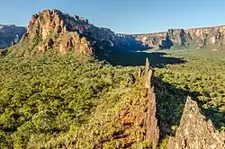 A vegetação do estado de Mato Grosso é constituída por três tipos de biomas são: Cerrado, Pantanal e a Floresta amazônica.[52] O cerrado é o bioma predominante na região centro oeste, porém ocupa 38,29% do território estadual, situado até a depressões de Alto Paraguai e Guaporé, o sul e o sudeste do Planalto dos Parecis e ao sul do paralelo 13º com o limite do estado de Mato Grosso do Sul. Sua vegetação é composta por gramíneas, arbustos e árvores esparsas, tendo em sua característica caules retorcidos e raízes longas, que permitem a absorção da água mesmo durante a estação seca do inverno, nesse bioma é encontrado 1 500 espécies de animais, 161 das 524 espécies de mamíferos do mundo estão na região e apresenta 837 espécies de aves, 150 espécies de anfíbios e 120 espécies de répteis e sendo presente vertebrados (mamíferos, aves, peixes, repteis e anfíbios.) e invertebrados (insetos, moluscos, etc.).[52]