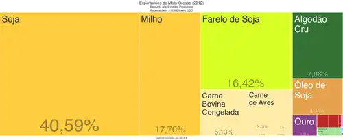 A economia de Mato Grosso possui a maior participação no setor primário do país, segundo pesquisa realizada em 2022 pelo Instituto Brasileiro de Geografia e Estatística, sua riqueza produzida no periodo foi maior que todos os estados da região sul (Paraná, Rio Grande do Sul e Santa Catarina) e superior aos estados da região sudeste como São Paulo e Minas Gerais, tendo o maior rebanho de gado e a maior produção agrícola do país[25] — sendo o maior produtor nacional de commodities como a soja, milho e algodão[26] e se fosse um país independente, seria o terceiro maior produtor de soja do mundo, (ficando, em 2023, atrás do Brasil e dos Estados Unidos) quando classificada safra anual, segundo o Instituto Mato-Grossense de Economia Agropecuária (IMEA).[27] Além de grande produção agrícola, Mato Grosso é rico em biodiversidade, na fronteira com o estado de Mato Grosso do Sul concentra o Pantanal a maior planície alagada do planeta e considerada pela Unesco como Patrimônio Natural Mundial e Reserva da Biosfera, o estado traz em seu patrimônio histórico e cultural uma riqueza histórica, cultural e gastronômica.[28] Possui indicadores sociais, econômicos e ambientais distintos, como o decimo maior PIB e o quarto maior PIB per capita entre as unidades da federação,[29] é o décimo segundo com maior taxa de mortalidade infantil,[5] a décima terceira maior taxa de homicídios[30] e maior desmatador da Amazônia Legal e de ocorrência de queimadas no pais.[31]
