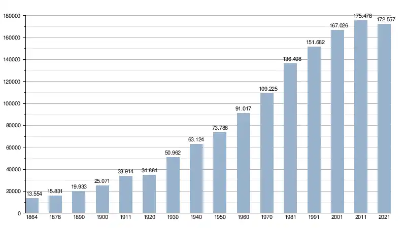 | 1864 | 1878 | 1890 | 1900 | 1911 | 1920 | 1930 | 1940 | 1950 | 1960 | 1970 | 1981 | 1991 | 2001 | 2011 | 2021 |