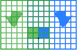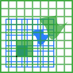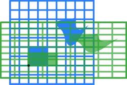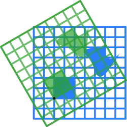 Por exemplo, a matriz 2 × 2 pode ser vista como a transformação do quadrado unitário num paralelogramo com vértices em (0, 0), (a, b), (a + c, b + d) e (c, d). O paralelogramo retratado à direita é obtido multiplicando A sucessivamente por cada um dos vetores coluna , , e . Estes vetores definem os vértices do quadrado unitário.[67] A tabela seguinte mostra várias matrizes reais 2 × 2 com as aplicações lineares associadas de . O original a azul é mapeado para a grade e formas a verde. A origem (0, 0) está marcada com um ponto preto.