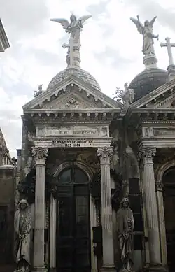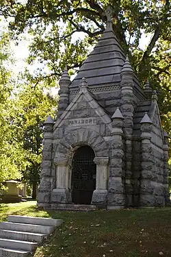 Mais tarde, os mausoléus tornaram-se particularmente populares na Europa e suas colônias durante os primeiros períodos modernos e modernos. Um único mausoléu pode ser permanentemente selado. Um mausoléu envolve uma câmara funerária totalmente acima do solo ou dentro de uma abóbada funerária abaixo da superestrutura. Este contém o corpo ou corpos, provavelmente dentro de sarcófagos ou nichos de sepultamento. Os mausoléus modernos também podem atuar como columbários (um tipo de mausoléu para restos cremados) com nichos adicionais de urnas cinerárias. Os mausoléus podem estar localizados em um cemitério, um cemitério ou em terras privadas.[2][3]
