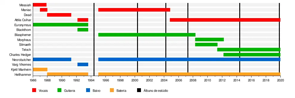 | Ex-integrantes | Euronymous (falecido) Blasphemer Maniac Dead (falecido) Messiah Snorre W. Ruch Varg Vikernes Ver lista |