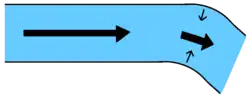 Escoamento secundário: existe um equilíbrio de forças entre as forças de pressão que apontam para a curva interna do rio e as forças centrífugas que apontam para a curva externa do rio. No contexto de rios sinuosos, existe uma camada limite dentro da fina camada de fluido que interage com o leito do rio. Dentro dessa camada e seguindo a teoria da camada limite padrão, a velocidade do fluido é efetivamente zero. A força centrífuga, que depende da velocidade, também é efetivamente zero. A força de pressão, no entanto, não é afetada pela camada limite. Portanto, dentro da camada limite, a força de pressão domina e o fluido se move ao longo do fundo do rio da curva externa para a curva interna. Isso inicia o fluxo helicoidal: ao longo do leito do rio, o fluido segue aproximadamente a curva do canal, mas também é forçado em direção à curva interna; longe do leito do rio, o fluido também segue aproximadamente a curva do canal, mas é forçado, até certo ponto, da curva interna para a externa.