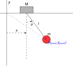Considere um pêndulo de massa m e comprimento ℓ, que está ligado a um suporte com massa M, que pode se mover ao longo de uma linha na direção x. Seja x a coordenada ao longo da linha de apoio, vamos indicar a posição do pêndulo pelo ângulo θ em relação à vertical.