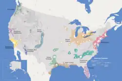 | Bos-wash[10] ou Nordeste Estadunidense | Nordeste dos Estados Unidos | ±50 mi hab. | Boston, Nova Iorque, Filadélfia, Baltimore e Washington, DC | ||||||||