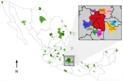 | Centro do México[11] | Centro e vale do México | Cidade do México, Puebla, Tlaxcala, Pachuca, Cuernavaca, Tula de Allende, Tulancingo e Cuautla | |||||||||