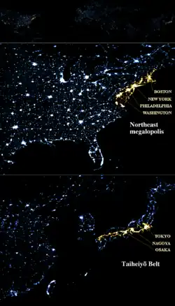 | Tokkaido[10] | Sudeste do Japão | ±45 mi hab. | Tóquio, Kawasaki, Iocoama, Nagoia, Quioto, Kōbe, Nagasaki e Osaka | ||||||||